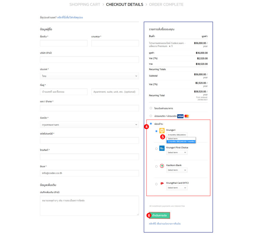 ขั้นตอนที่ 4-6 : จากนั้นเลือกรูปแบบการชำระเงินทางด้านขวามือ > ผ่อนชำระ > ทำการ เลือกบัตรสำหรับผ่อนชำระ และกดเมนู Select item และเลือกรูปแบบ 3 Mounth > จากนั้นและทำการกดที่เมนู ดำเนินการต่อ