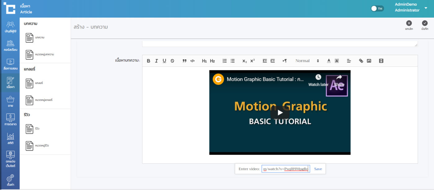 การใส่วิดีโอ ลงในรีวิว > เลือก ไอคอนวิดีโอ ทางด้านขวา > ใส่ Embed URL ลิ้งค์วิดีโอที่ต้องการ > เลือกเมนู Save