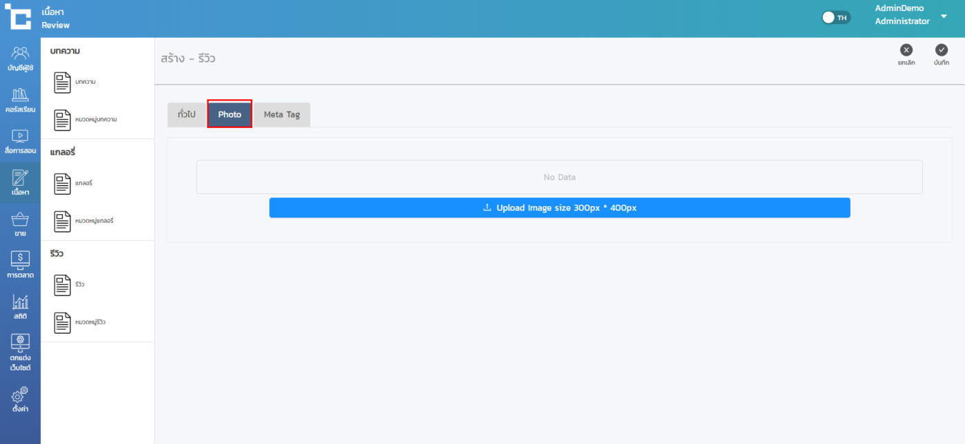 ขั้นตอนที่ 3 : ใส่รูปภาพของผู้รีวิว เลือกแถบหน้า รูปภาพ > อัพโหลดรูปภาพหน้าปก ขนาด 300 x 400 px