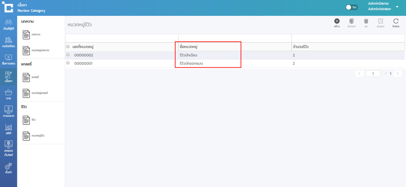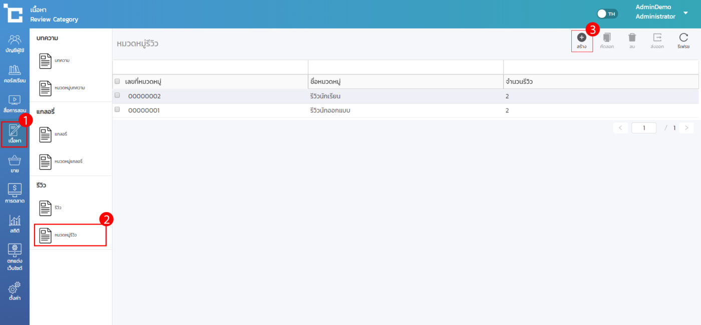 ขั้นตอนที่ 1 : เลือกเมนู เนื้อหา > เลือกเมนู หมวดหมู่รีวิว > เลือกเมนูคำสั่ง สร้าง