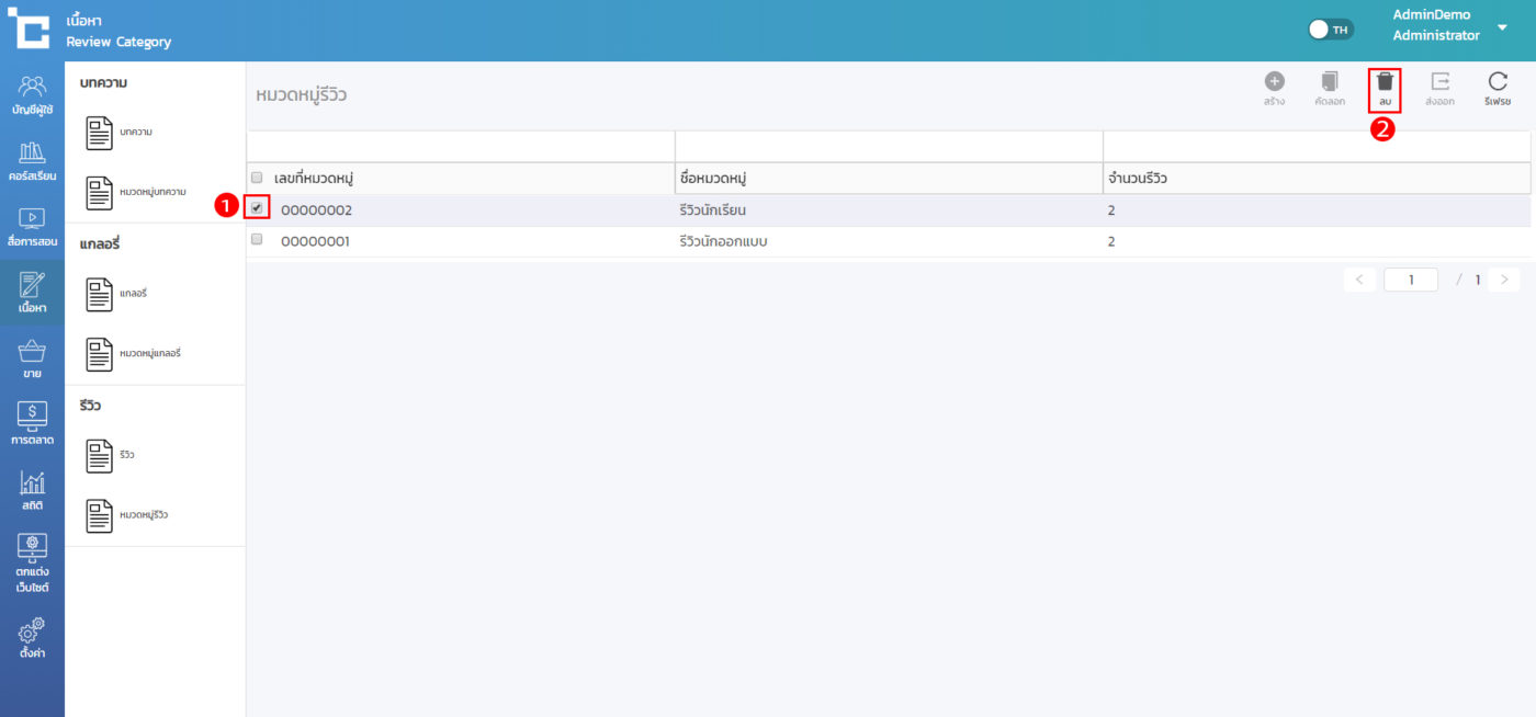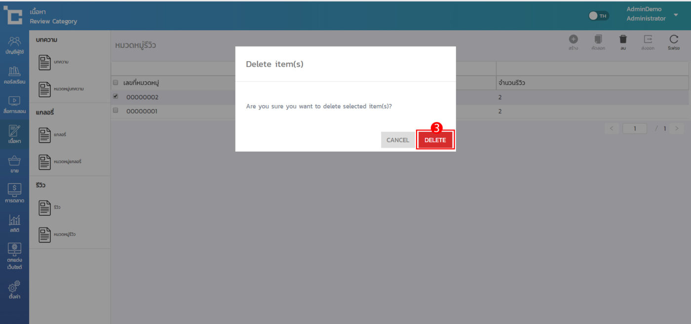 เลือกหมวดหมู่ที่ต้องการลบ > เลือกเมนูคำสั่ง ลบ > เลือกปุ่มเมนู Delete เพื่อทำการยืนยันการลบหมวดหมู่