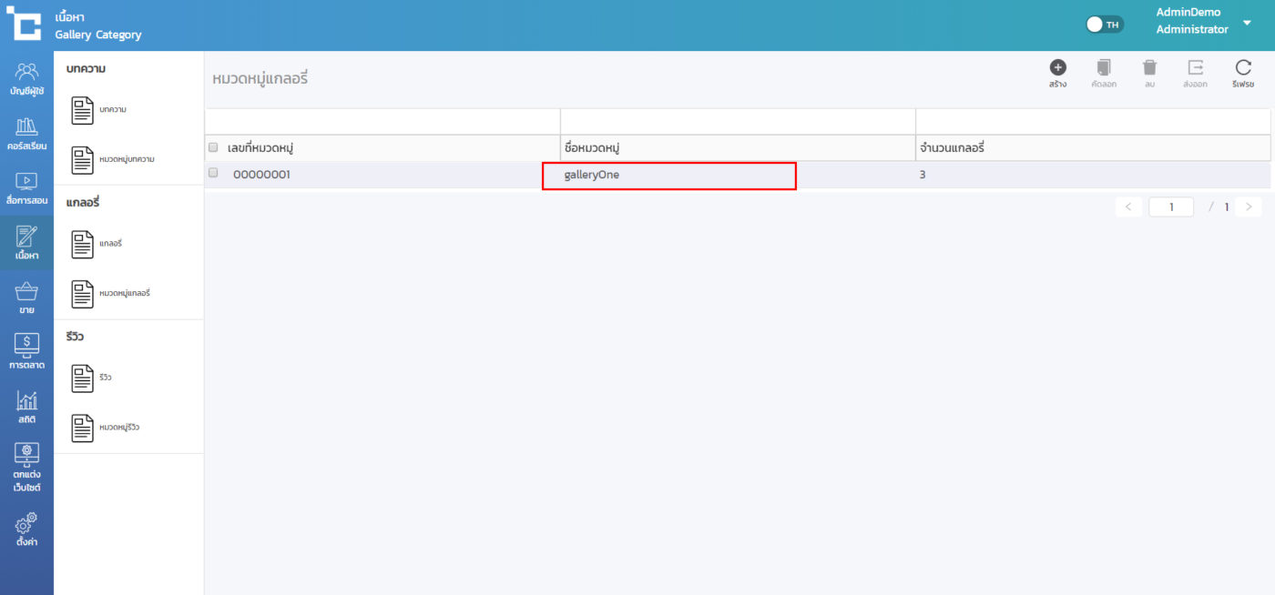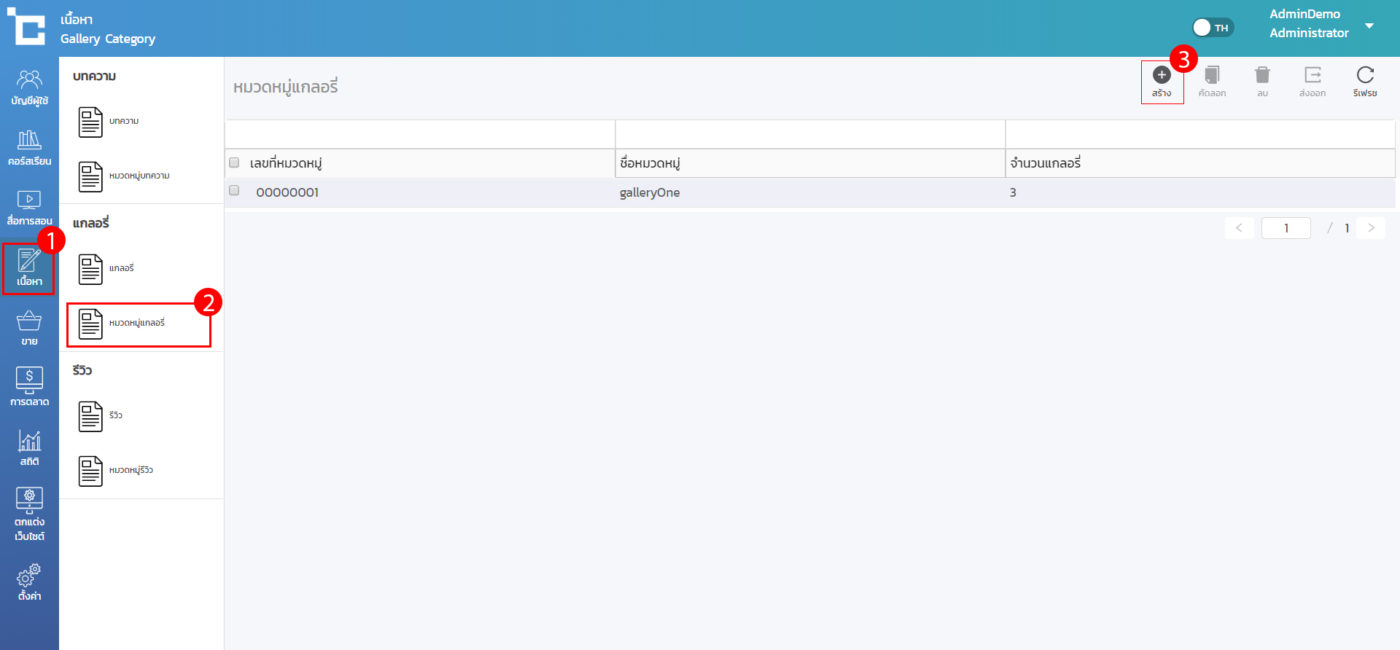 ขั้นตอนที่ 1 : เลือกเมนู เนื้อหา > เลือกเมนู หมวดหมู่แกลอรี่ > เลือกเมนูคำสั่ง สร้าง
