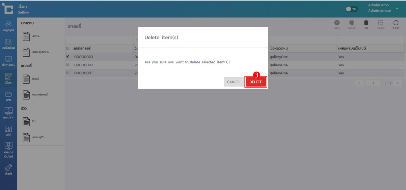 เลือกหมวดหมู่ที่ต้องการลบ > เลือกเมนูคำสั่ง ลบ > เลือกปุ่มเมนู Delete เพื่อทำการยืนยันการลบหมวดหมู่