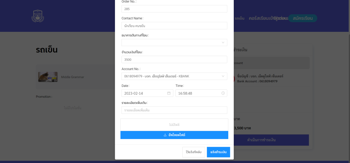 กรอกข้อมูลให้ครบพร้อมแนบใบเสร็จการชำระเงิน หลังจากนั้นคลิกที่ปุ่ม แจ้งชำระเงิน