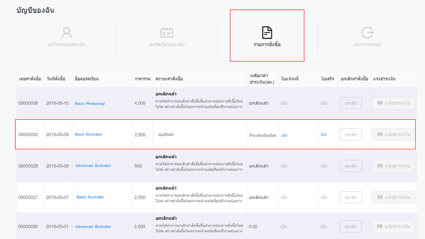 - เมนูรายการสั่งซื้อ รายการที่ท่านสั่งซื้อ เมื่อท่านทำการ ชำระเงินเรียบร้อยแล้ว > ท่านจึงจะสามารถเข้าเรียนตามรายการที่ซื้อไว้ได้