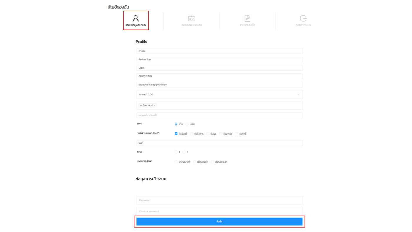 - เมนูแก้ไขข้อมูลสมาชิก หากท่านต้องการแก้ไข้ข้อมูลส่วนตัว กดเลือกเมนู > แก้ไขข้อมูลส่วนตัว > ทำการแก้ไขข้อมูลเรียบร้อย > กดเมนู บันทึก เพื่อทำการบันทึกข้อมูล
