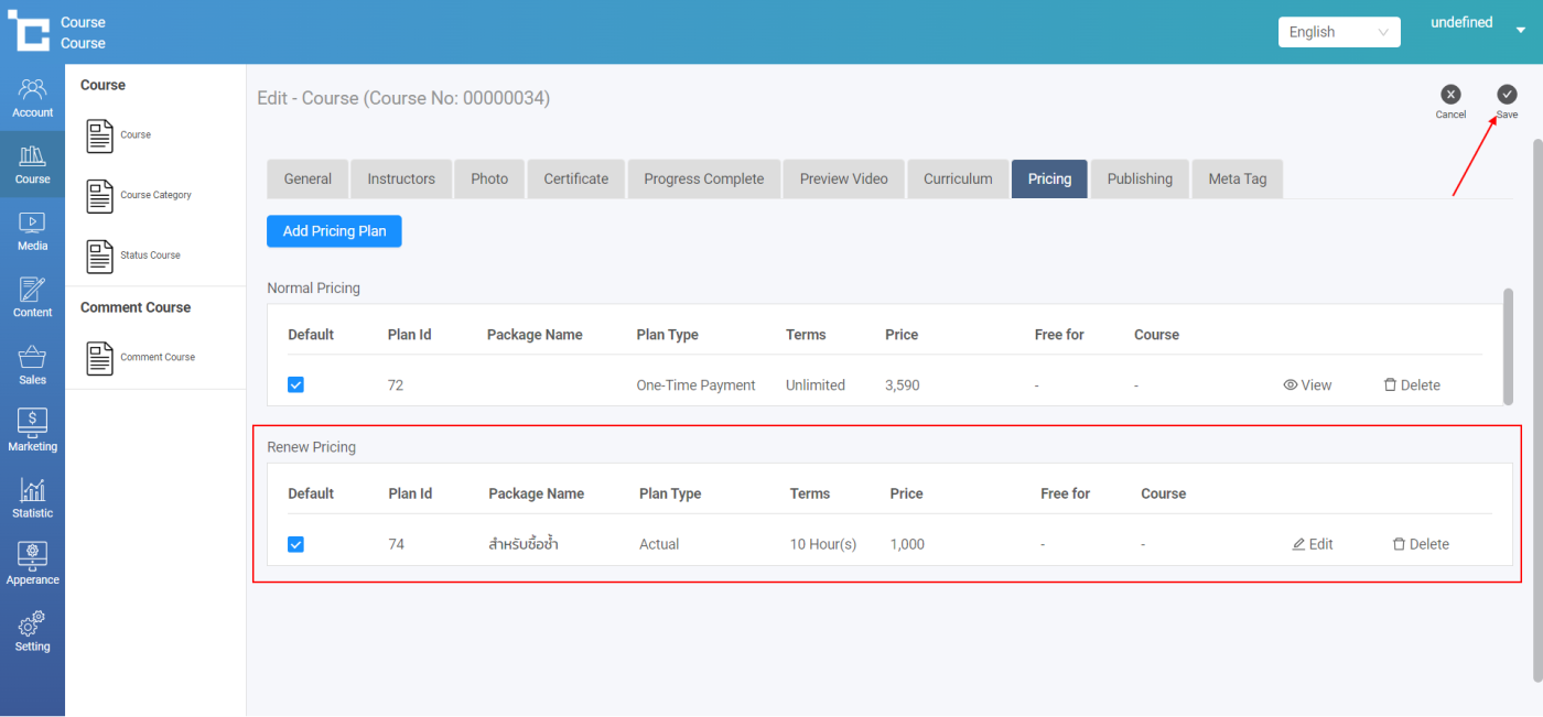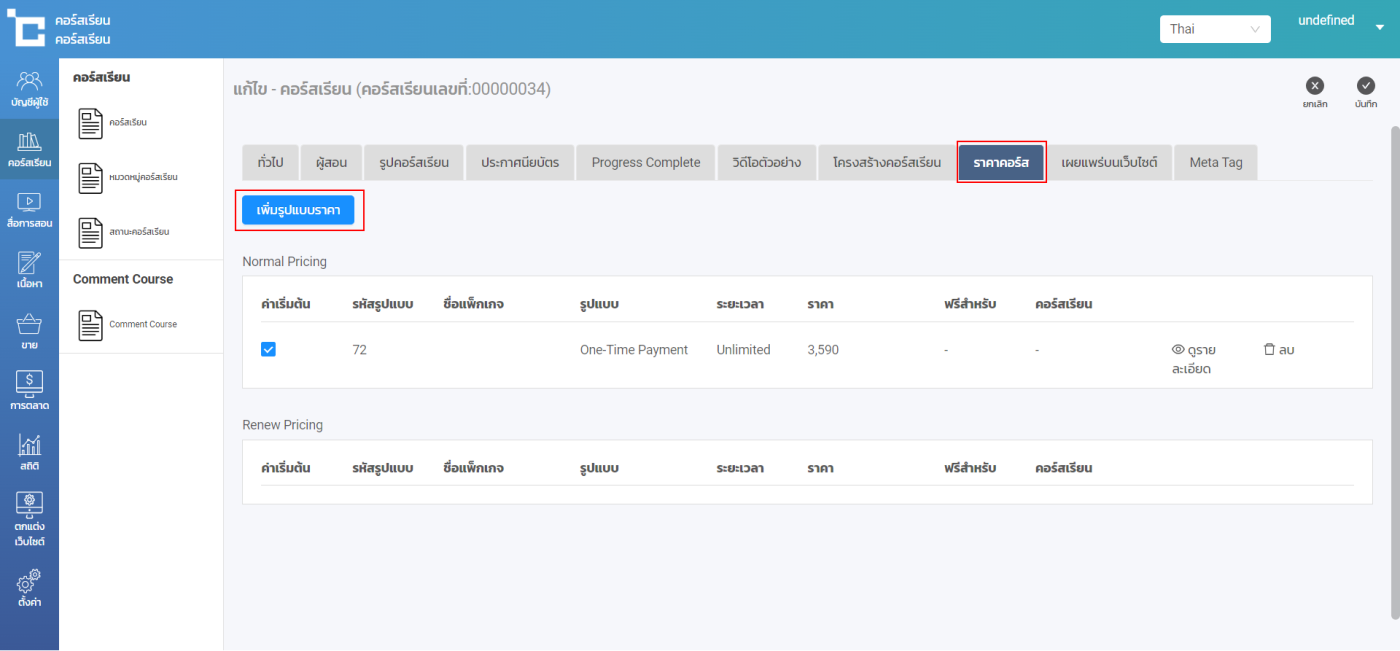 ไปยังเมนูคอร์สเรียน > เลือกคอร์สเรียนที่ต้องการสร้างราคา Renew > เลือกแถบ ราคาคอร์ส