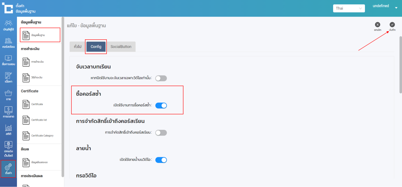 - ไปยังเมนู ตั้งค่า > ข้อมูลพื้นฐาน > Config > เปิดใช้งานการซื้อคอร์สซ้ำ