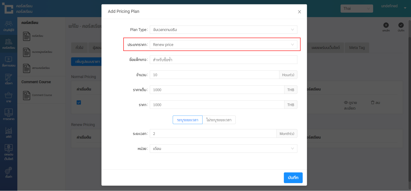 ฟังก์ชั่น Renew Courses มีไว้สำหรับการตั้งรูปแบบราคาสำหรับให้นักเรียนสามารถซื้อคอร์สเรียนซ้ำได้ ในกรณีที่หมดเวลาเรียนแล้ว