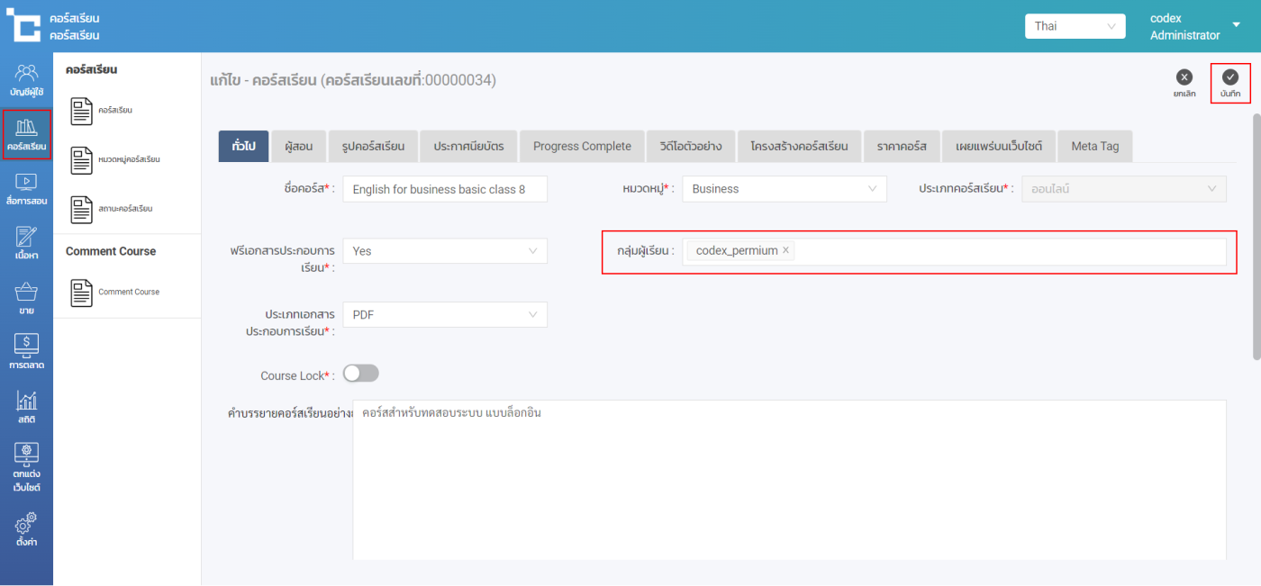 ไปยังเมนูคอร์สเรียน > เลือก กลุ่มผู้เรียน กด Save