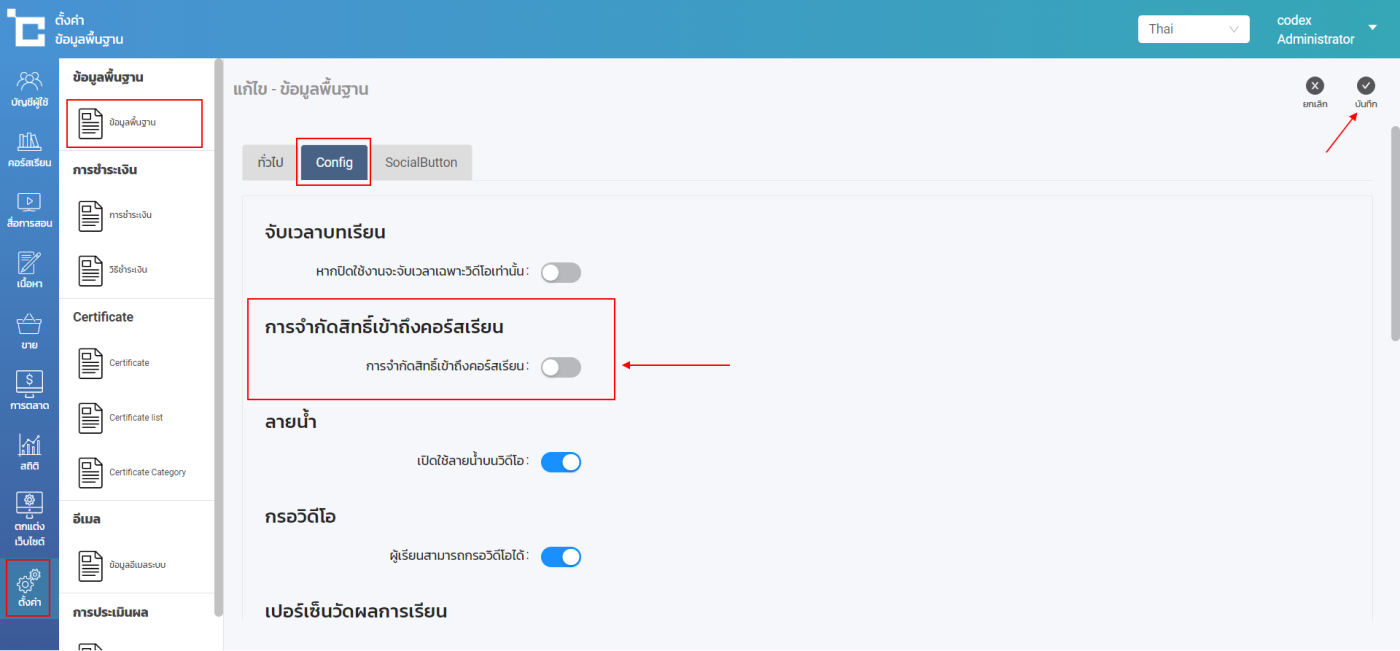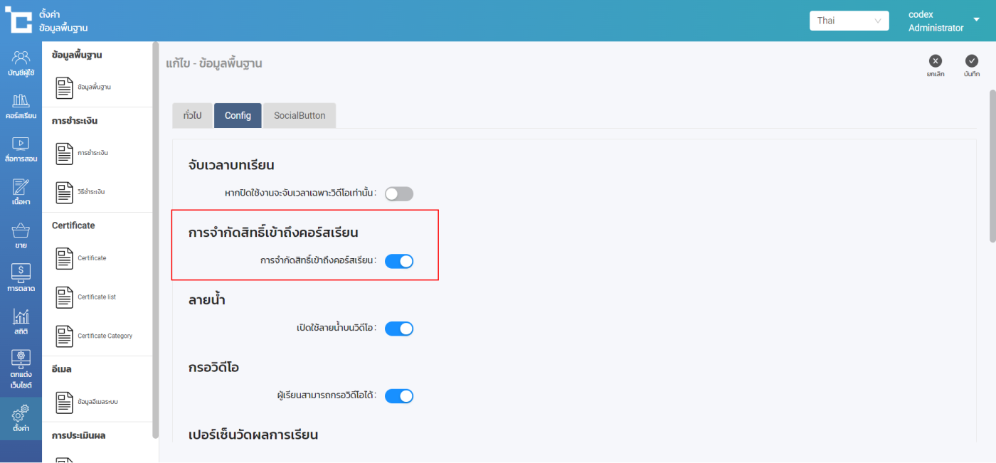 - ไปยังเมนู ตั้งค่า > ข้อมูลพื้นฐาน > Config > เปิดใช้งาน การจำกัดสิทธิ์เข้าถึงคอร์สเรียน
