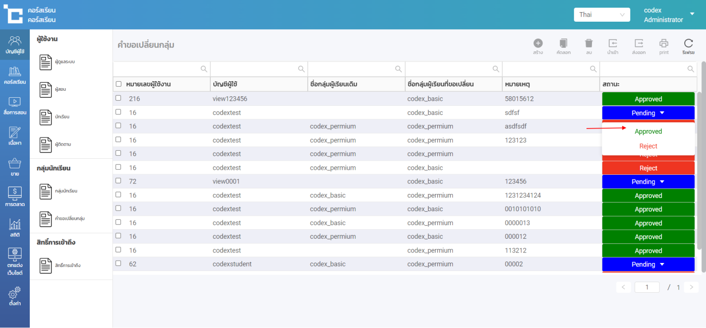 - ไปยังเมนู บัญชีผู้ใช้ > คำขอเปลี่ยนกลุ่ม > ปรับสถานะเป็น Approve