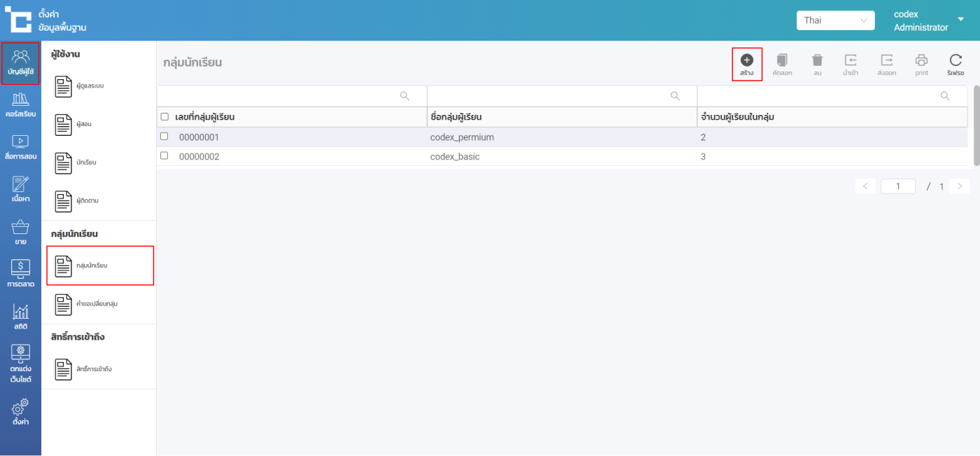 2. สร้างกลุ่มผู้เรียนตามความเหมาะสมของการใช้งาน ไปยังเมนู บัญชีผู้ใช้ > กลุ่มนักเรียน กด สร้าง เพื่อสร้างกลุ่มผู้เรียน