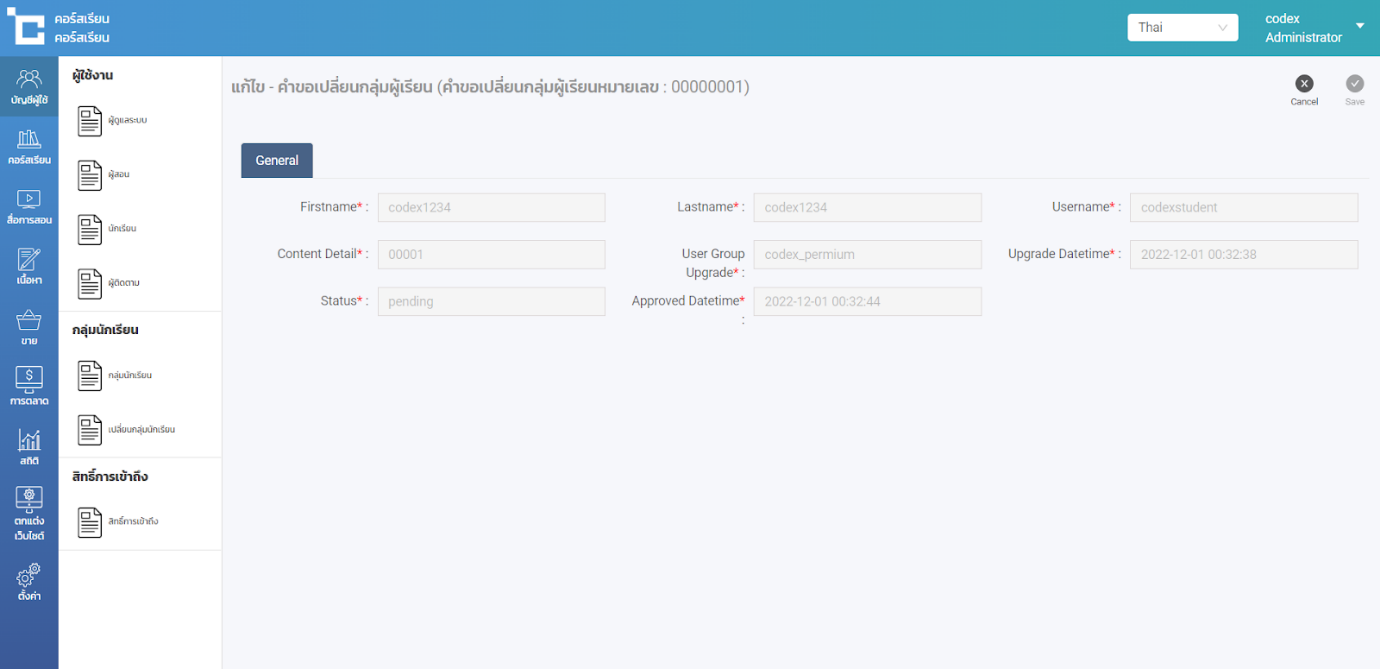 - เมนูด้านในของแต่ละคำขอเปลี่ยนกลุ่มผู้เรียนจะมีรายละเอียดต่างๆที่แสดงอยู่เพื่อใช้เป็นการตรวจสอบ