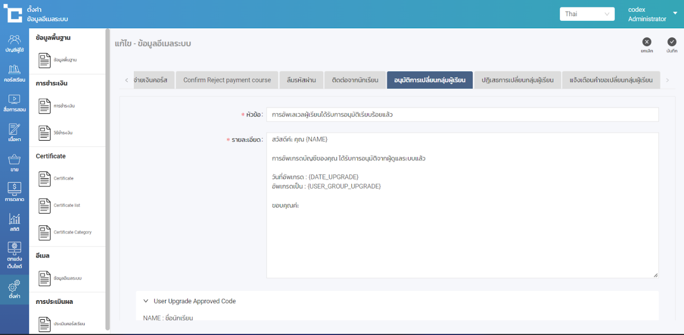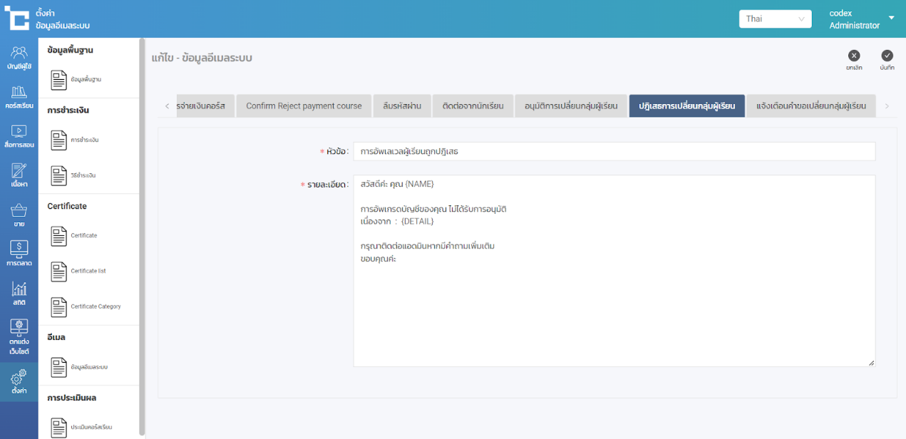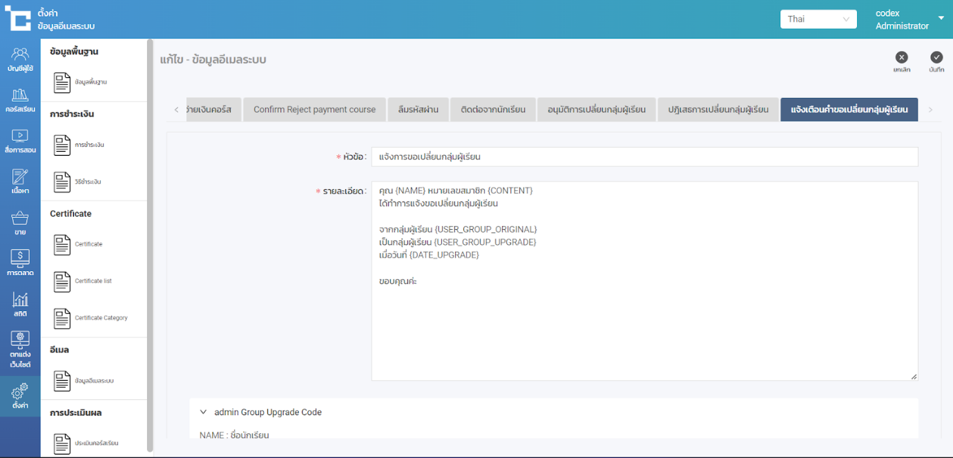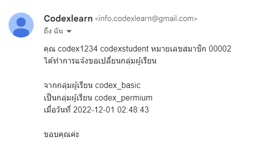เมื่อนักเรียนขอเปลี่ยนกลุ่มผู้เรียนระบบจะแจ้งเตือนแอดมินผ่านอีเมลแจ้งที่ตั้งค่าไว้ในระบบ เช่นเดียวกับเมื่อสถานะคำชขอถูกอนุมัติหรือปฎิเสธ โดยจะสามารถตั้งค่าแบบฟอร์มของเมลได้ที่เมนู ตั้งค่า > ข้อมูลอีเมลระบบ