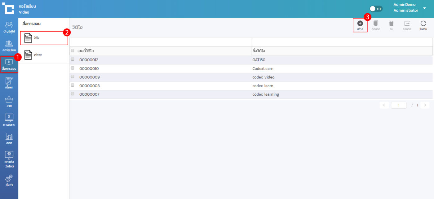 ขั้นตอนที่ 1 : เลือกเมนู สื่อการสอน > เลือกเมนู วิดีโอ > กดเลือกเมนู สร้าง
