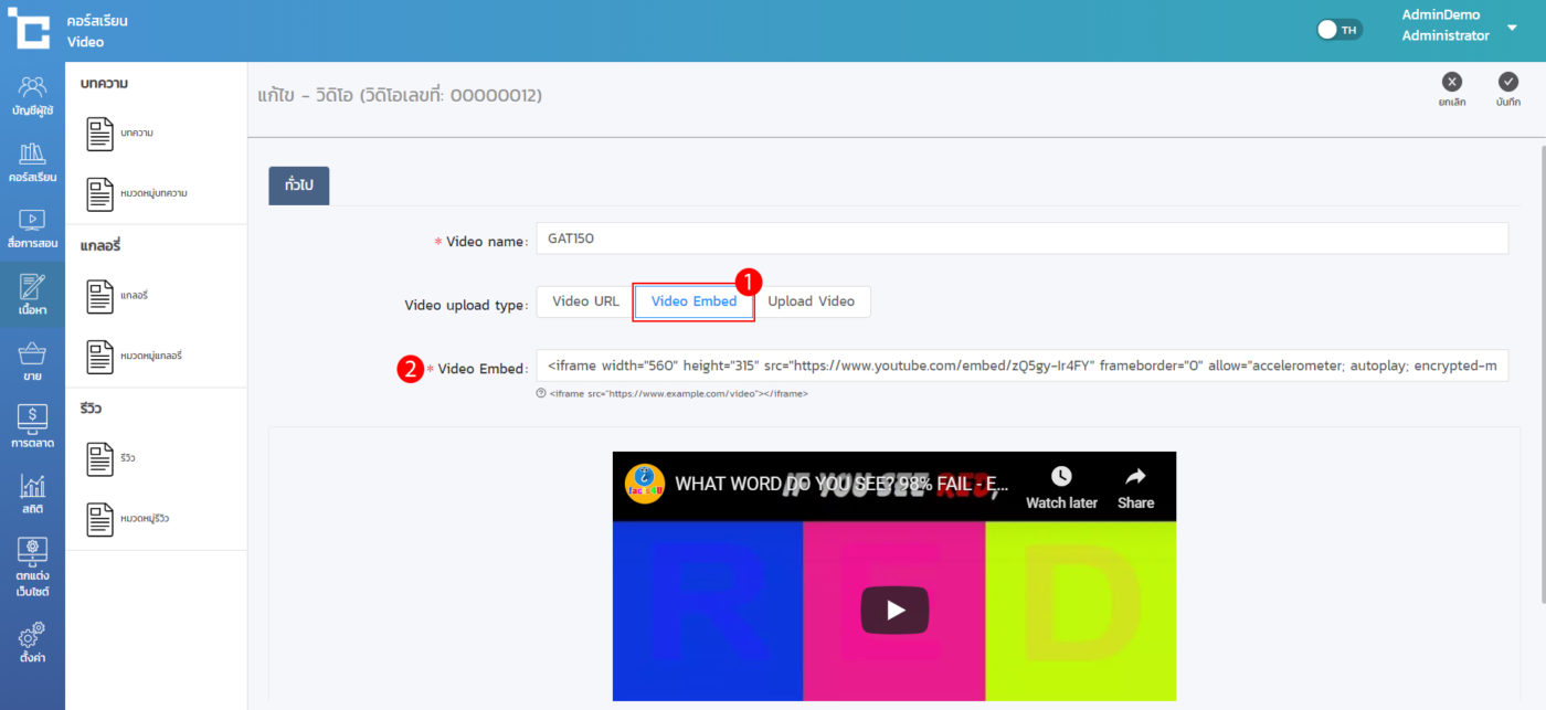 • Video Embed เลือกแถบเมนู Video Embed > นำลิ้งค์ แบบ Embed มาวางลงในช่อง