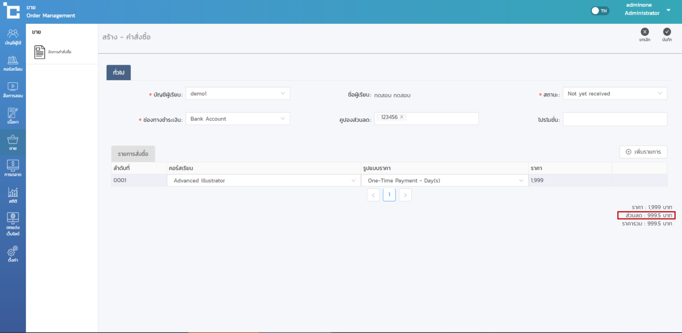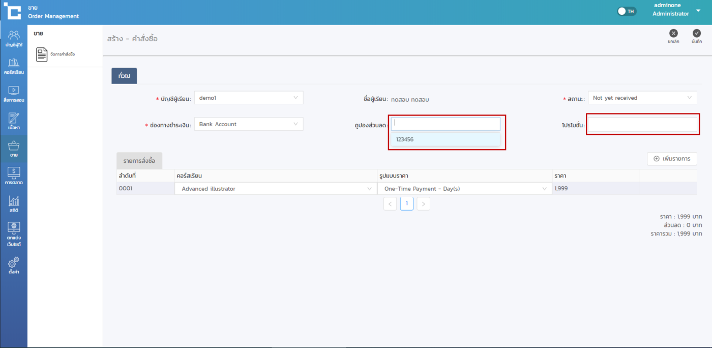 2.ใส่ข้อมูลของผู้ซื้อ > เลือกไปยังแถบ คูปอง หรือ โปรโมชั่น และเลือกที่ต้องการ > จากนั้นกด บันทึก