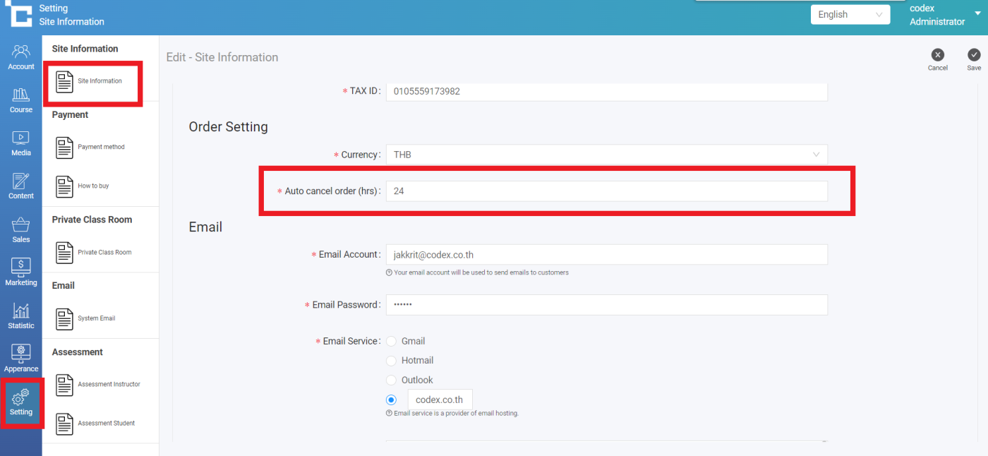 คู่มือการใช้งาน วิธีกำหนดระยะเวลาชำระเงิน Facebook iconแชร์Twitter iconทวีตLINE iconส่งไลน์LINKED IN iconส่งไลน์ ไปยังเมนู Setting > Site Information > กรอกระยะเวลาชำระเงินที่ช่อง Auto cancel order (hrs) Facebook iconแชร์Twitter iconทวีตLINE iconส่งไลน์LINKED IN iconส่งไลน์
