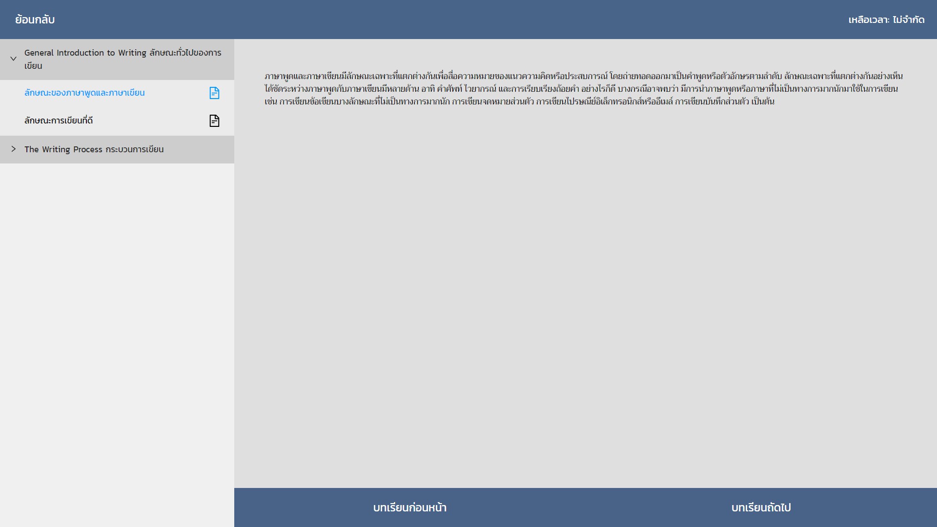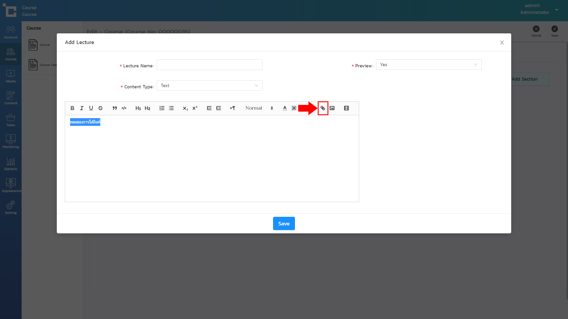 โดยตัวอย่างนี้เราจะสอนแทรกลิ้งค์เข้าไปในเนื้อหาของบทเรียน ซึ่งสามารถเข้าดูได้ที่ เมนู Course > Course > Curriculum