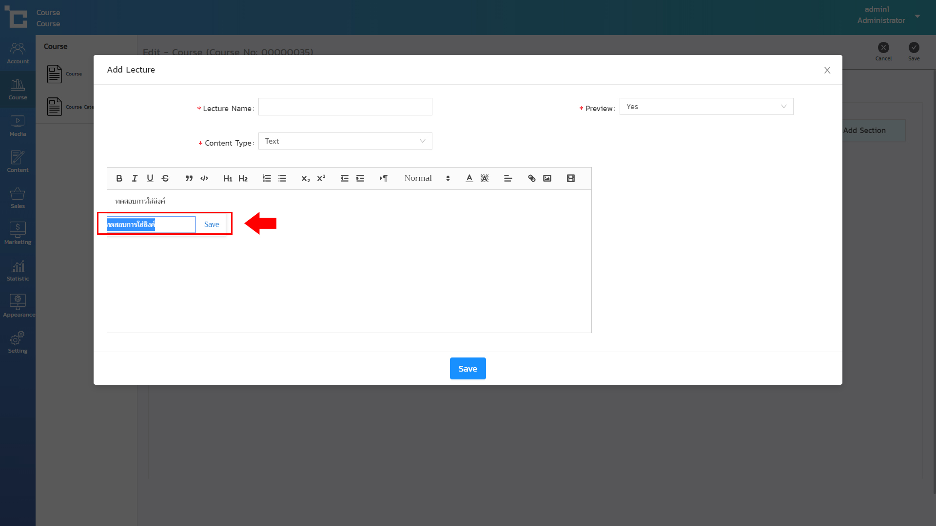ในที่นี้จะเป็นเนื้อหาของบทเรียน สามารถเข้าได้ที่เมนู Course > Course > Curriculum หากยังไม่เกิดสร้างบทเรียนมาก่อนให้กดปุ่ม Add Section ทางด้านขวามือ จากนั้นกดปุ่ม Add Lecture เพื่อสร้างบทเรียนใหม่ เมื่อสำเร็จจะพบกล่องจัดการข้อความ (Text Editor) ตามภาพ