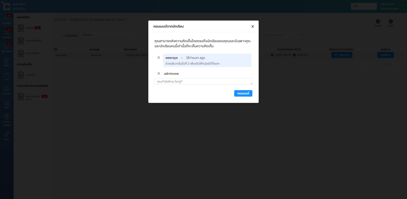 -ดูข้อความที่ผู้เรียนพิมพ์ส่งมาให้ รวมถึงคุณสามารถทำการตอบกลับผู้เรียนได้
