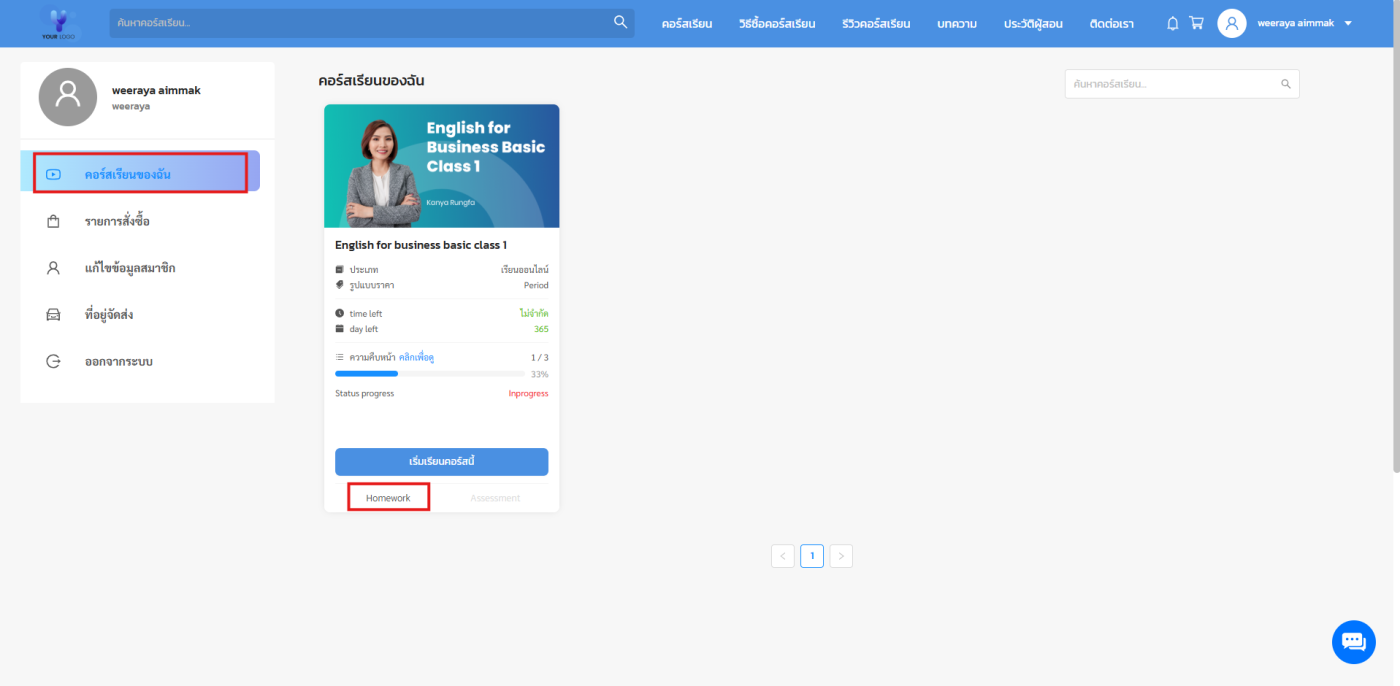 ให้คุณไปที่เมนูคอร์สเรียน > แถบ การบ้าน > คลิกที่แถบการบ้านในส่วนของคอร์สเรียนที่คุณต้องการ