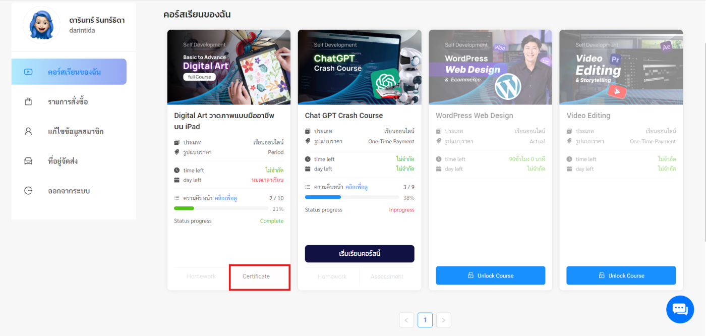• สามารถดาวน์โหลดได้ที่ คอร์สเรียนของฉัน > Certificate