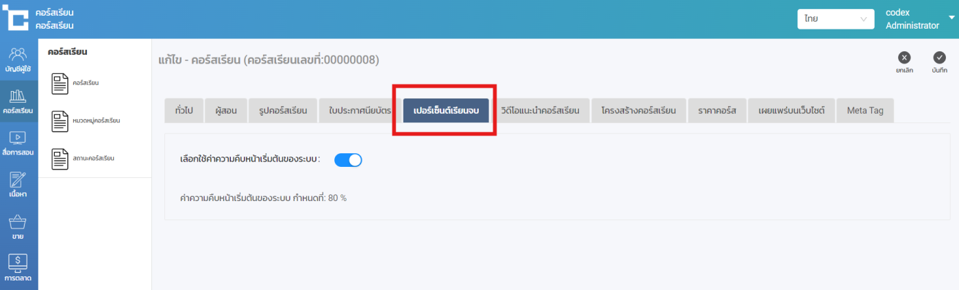 จากนั้นทำการกำหนด เปอร์เซ็นต์เรียนจบ (Completion Progress) เพื่อตั้งเงื่อนไขที่ผู้เรียนจะได้รับใบประกาศนียบัตร