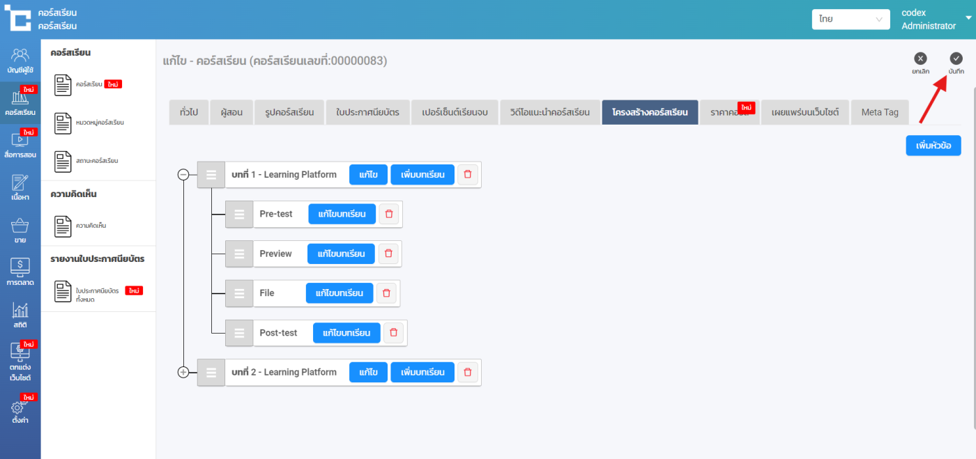 ขั้นตอนที่ 2 : ไปยังคอร์สเรียนที่ต้องการเปลี่ยนวิดีโอ เลือก โครงสร้างคอร์สเรียน > แก้ไขบทเรียน ที่ต้องการ