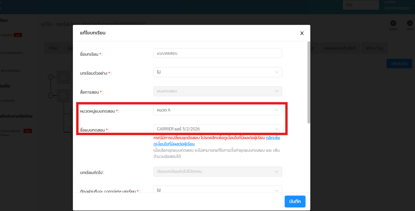 - เมนูคอร์สเรียน > โครงสร้างคอร์สเรียน > บทเรียน > ประเภท แบบทดสอบ