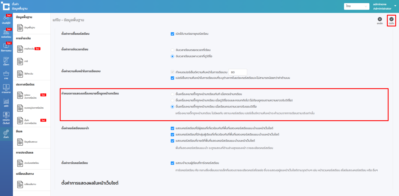 การตั้งค่าการแสดงเครื่องหมายติ๊กถูกหน้าบทเรียน
