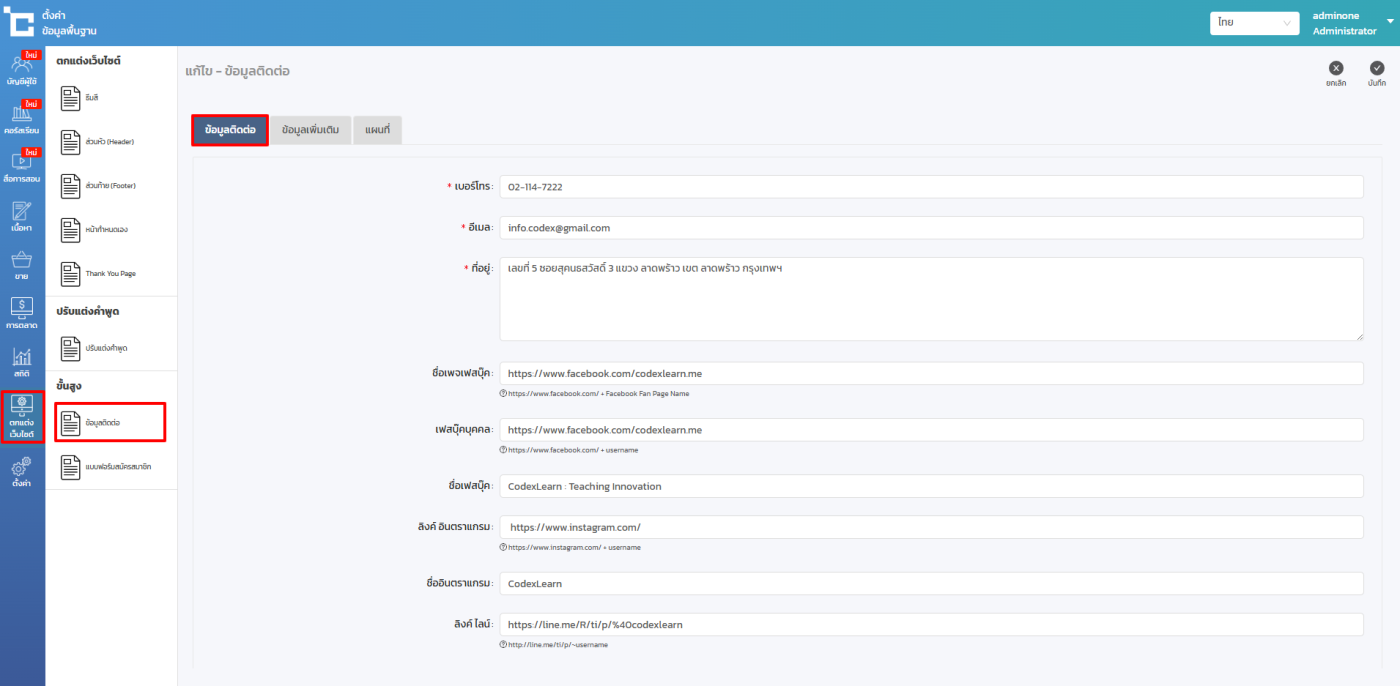 โดยคุณสามารถตั้งค่าข้อมูลผู้ติดต่อได้ที่เมนูตกแต่งเว็บไซต์ > ข้อมูลผู้ติดต่อ