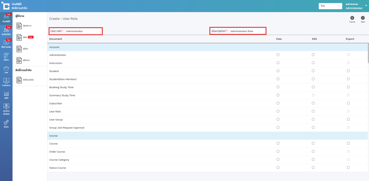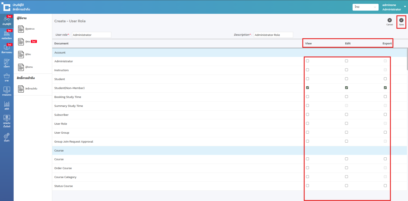 -กรณีที่คุณเลอกติ๊กช่อง Export ===> จะทำให้สิทธิ์ดังกล่าวสามารถนำออกข้อมูลได้