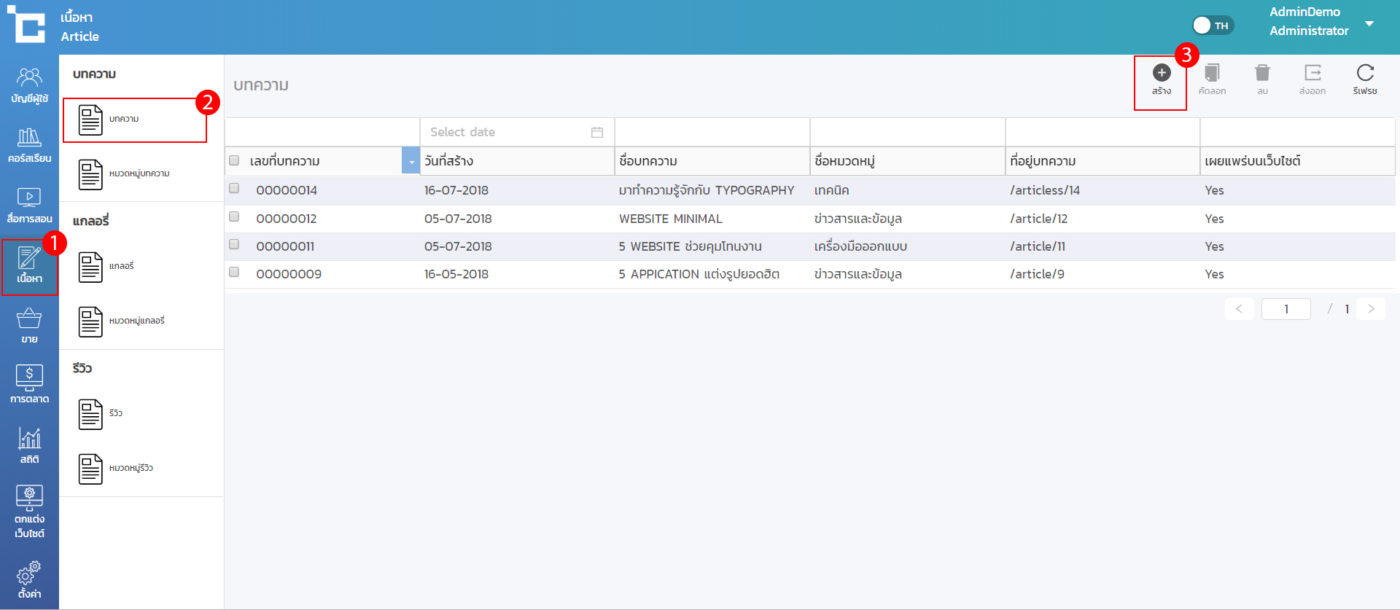 ขั้นตอนที่ 1 : เลือกเมนู เนื้อหา > เมนู บทความ > เมนูคำสั่ง สร้าง