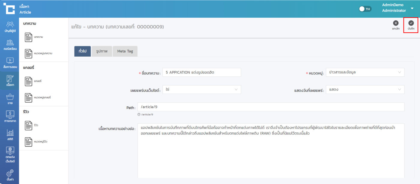 กรณีต้องการแก้ไขบทความ เลือกบทความที่ต้องการ > ทำการแก้ไขบทความ > บันทึก