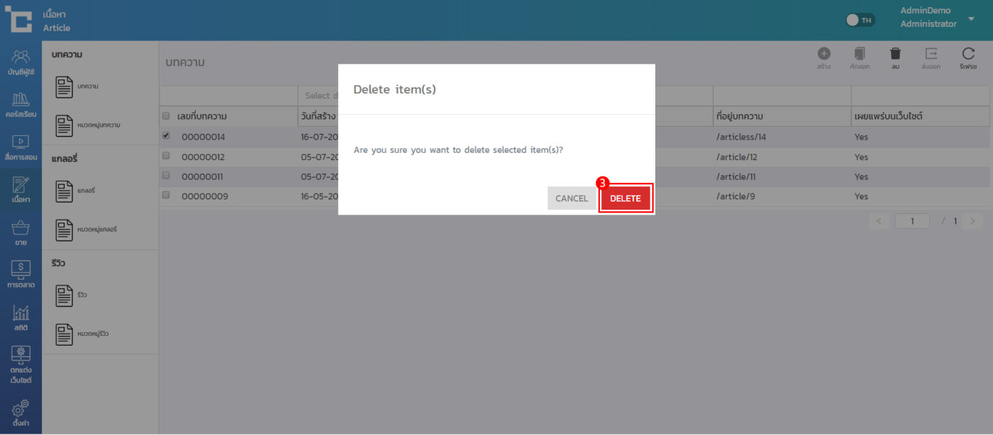 กรณีต้องการลบบทความ เลือกบทความที่ต้องการ > เลือกเมนู ลบ > เลือกเมนู Delete เพื่อทำการยืนยันการลบบทความ