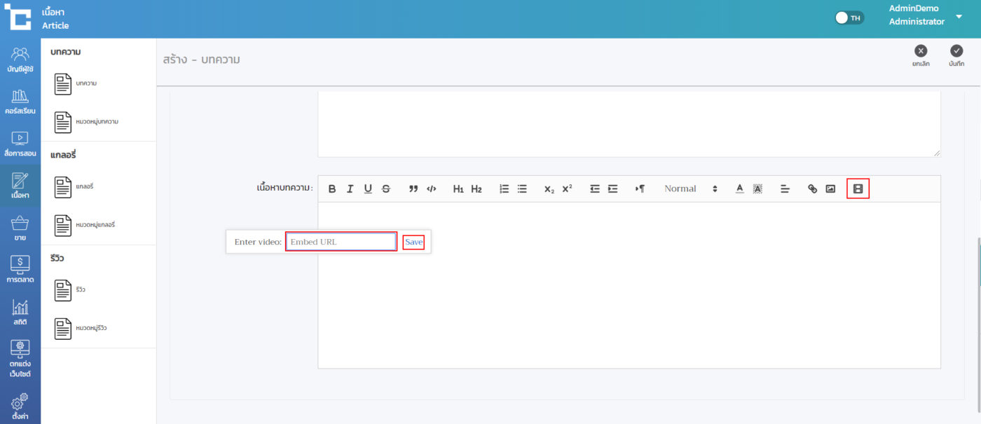 การใส่วิดีโอ ลงในบทความ > เลือก ไอคอนวิดีโอ ทางด้านขวา > ใส่ Embed URL ลิ้งค์วิดีโอที่ต้องการ > เลือกเมนู Save