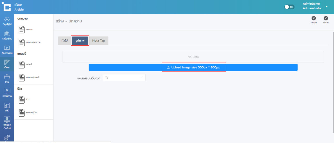 ขั้นตอนที่ 3 : ใส่รูปหน้าปกของบทความ เลือกแถบหน้า รูปภาพ > อัพโหลดรูปภาพหน้าปก ขนาด 500×300 px > เลือกสถานะการเผยแพร่เว็บไซต์