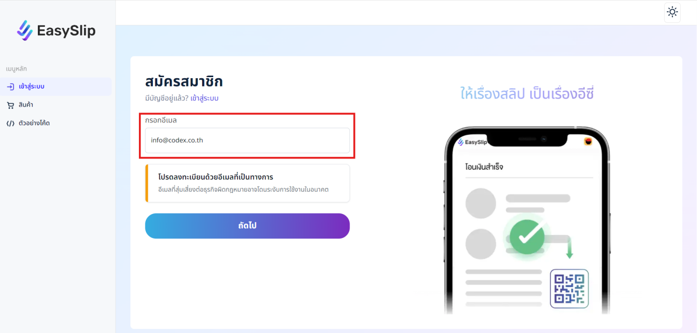 ขั้นตอนที่ 1 : ทำการสมัครบัญชีกับโปรแกรม Easy Slip