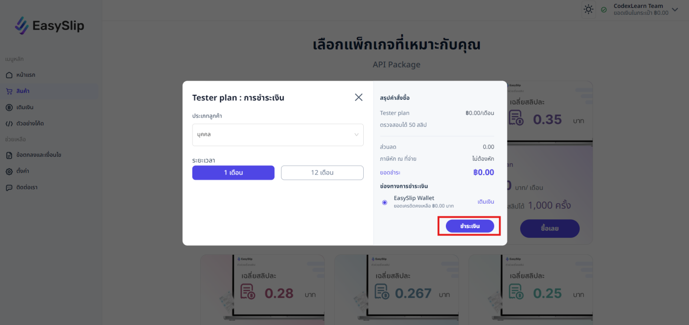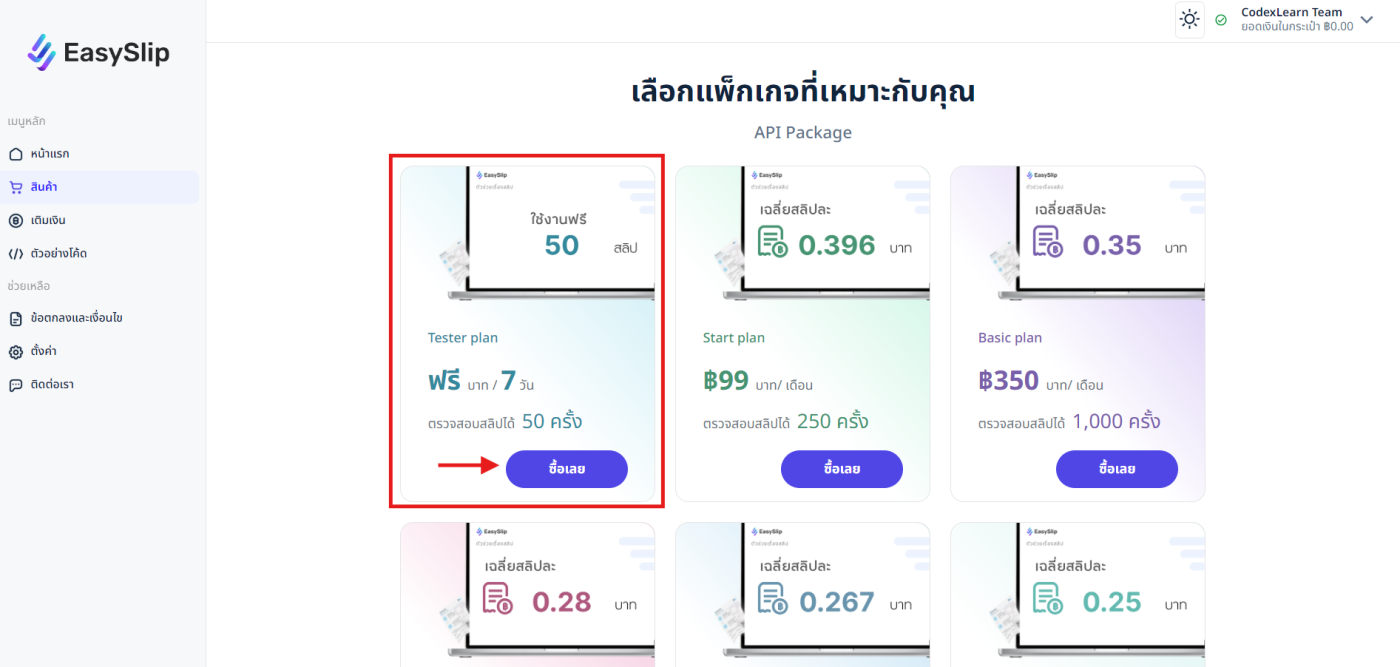 ท่านสามารถทำการเลือกแพ็คเกจที่ต้องการใช้งานได้เลย โดยแพ็คเกจของ Easy Slip จะอิงตามจำนวนการตรวจสอบสลิป สามารถเลือกแพ็คเกจ ฟรี เพื่อทดลองใช้งานก่อนได้ จากนั้นกด ซื้อเลย