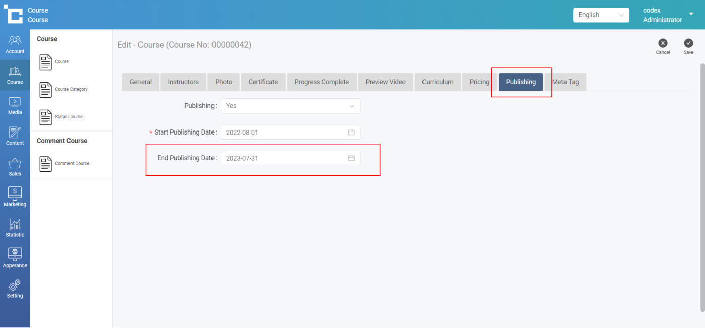 ไปยังแถบ Publishing > ตั้งค่า End Publishing Date