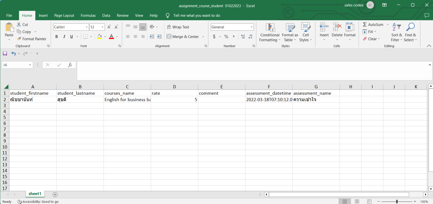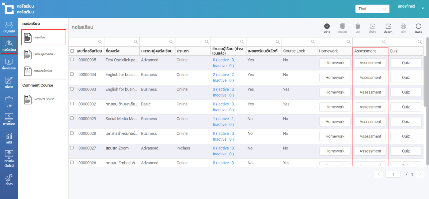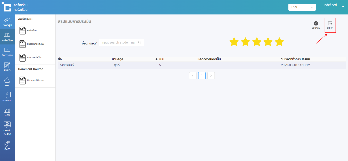 คู่มือการใช้งาน Export ข้อมูลระบบประเมินความพึงพอใจในบทเรียน Facebook iconแชร์Twitter iconทวีตLINE iconส่งไลน์LINKED IN iconส่งไลน์ ไปยังเมนู คอร์สเรียน > คอร์สเรียน > คลิก ไปยังปุ่ม Assessment ของคอร์สที่ต้องการ Export กดปุ่ม Export Facebook iconแชร์Twitter iconทวีตLINE iconส่งไลน์LINKED IN iconส่งไลน์