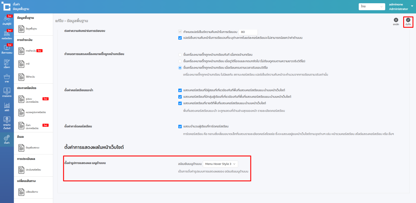 เมนูตั้งค่า > ข้อมูลพื้นฐาน > การตั้งค่า > ตั้งค่ารูปการแสดงผล เมนูด้านบน > เลือกรูปแบบอนิเมชันเมนูด้านบน > บันทึก