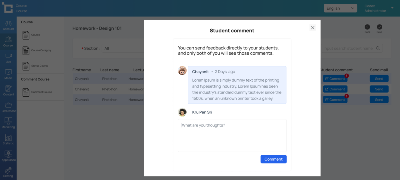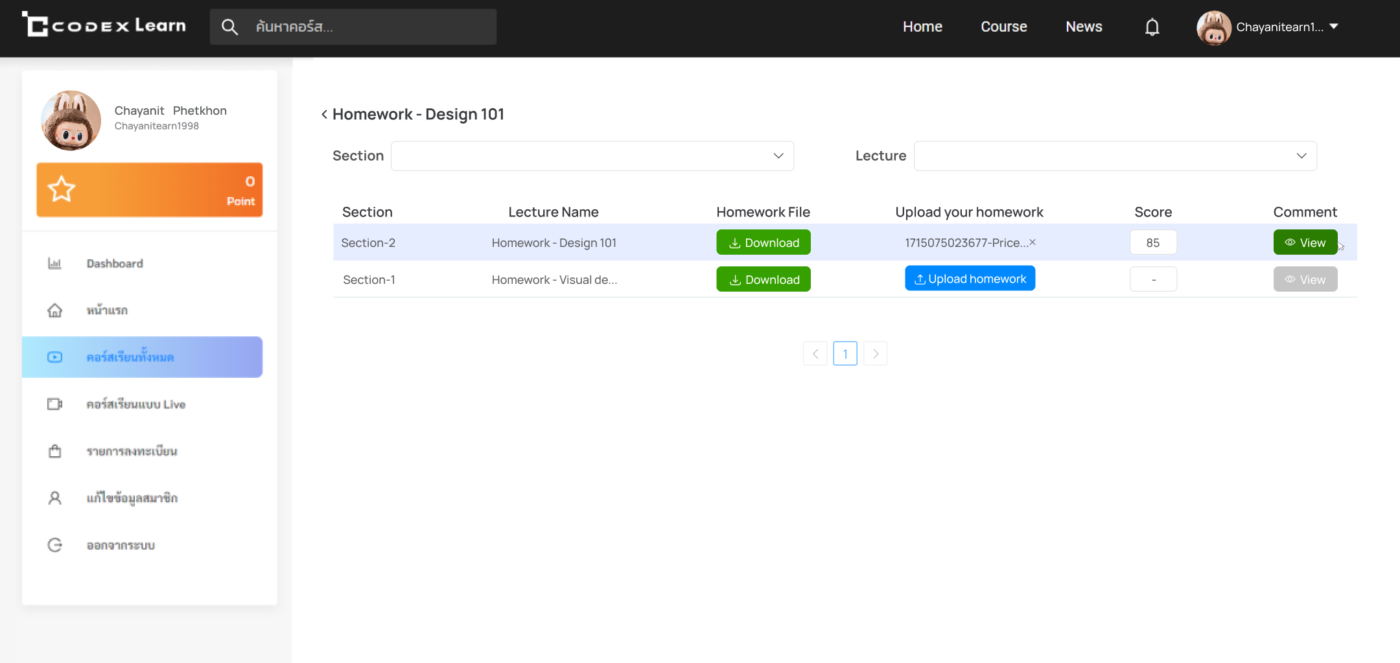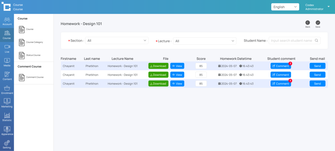 สามารถดูการบ้านของผู้เรียน และ Comment ของผู้เรียนได้ และใส่คะแนนให้กับผู้เรียนตามผลงานของผู้เรียน