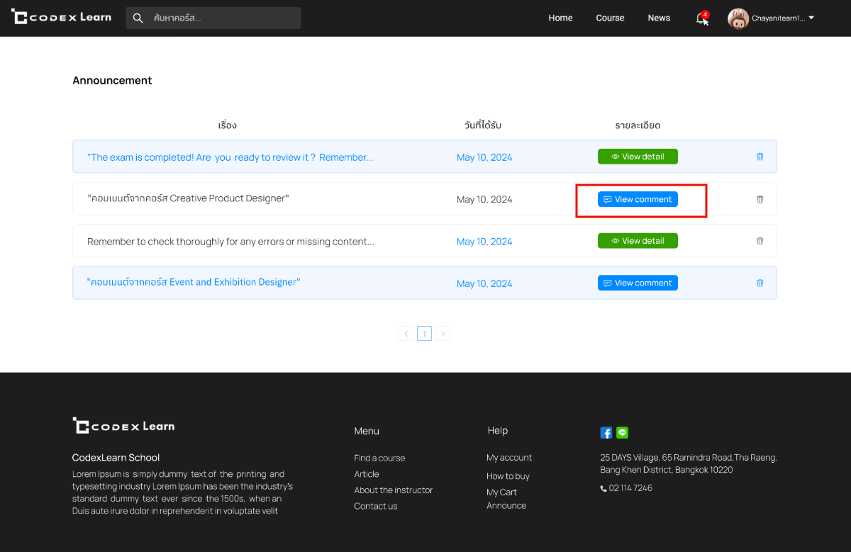 เมื่อผู้เรียนกดปุ่ม View Comment จะแสดงการตอบกลับของผู้สอน