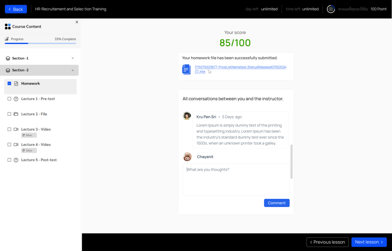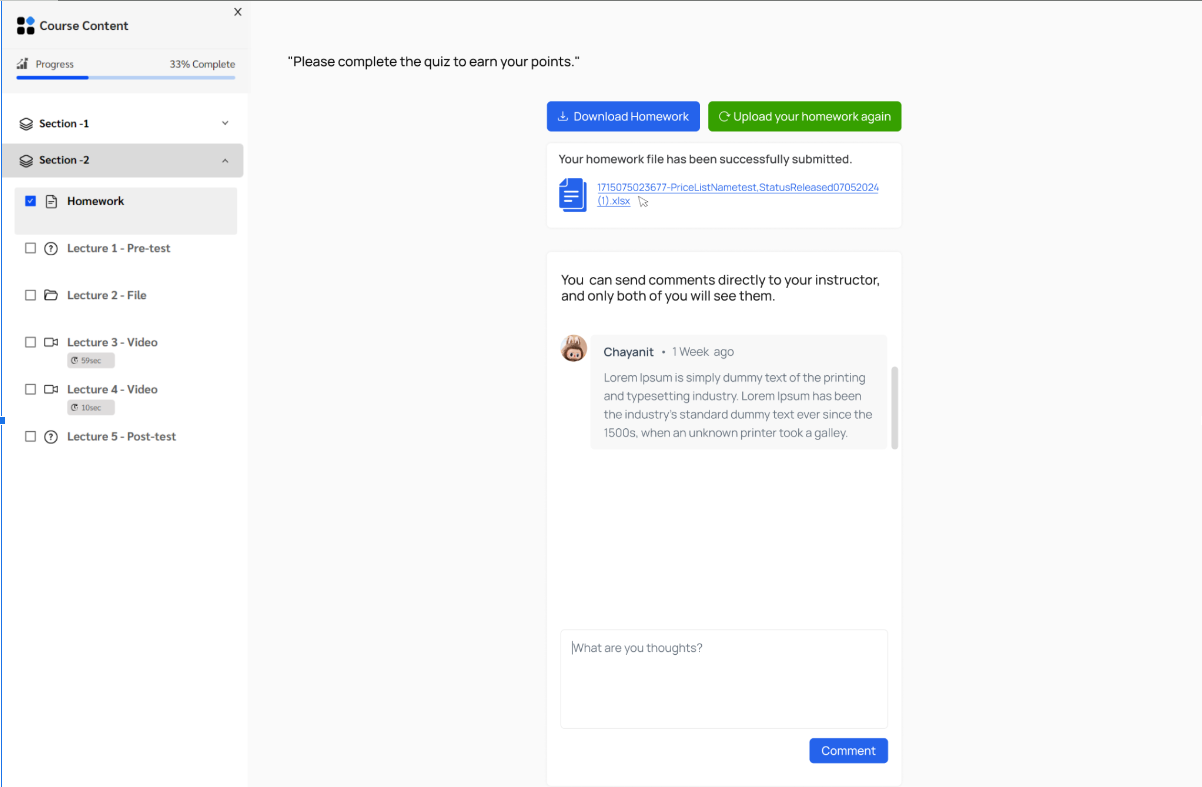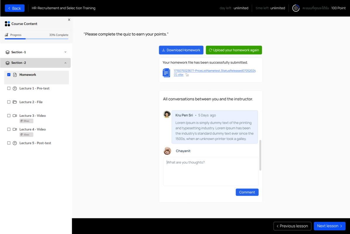 การส่งการบ้าน และ Comment เมื่อผู้เรียนต้องการสอบถามเกี่ยวกับเนื้อหาการบ้าน
