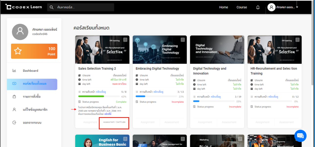 ในหน้า User ผู้เรียนจะได้รับการแจ้งเตือนจากตรงปุ่มกระดิ่งด้านบน