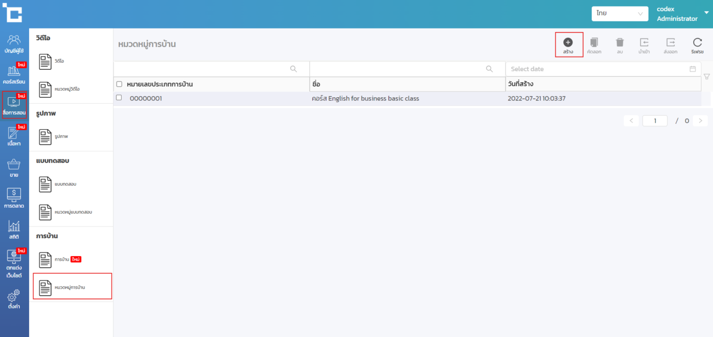 ทำการสร้างหมวดหมู่ ไปยังเมนู สื่อการสอน > หมวดหมู่การบ้าน > กดสร้าง