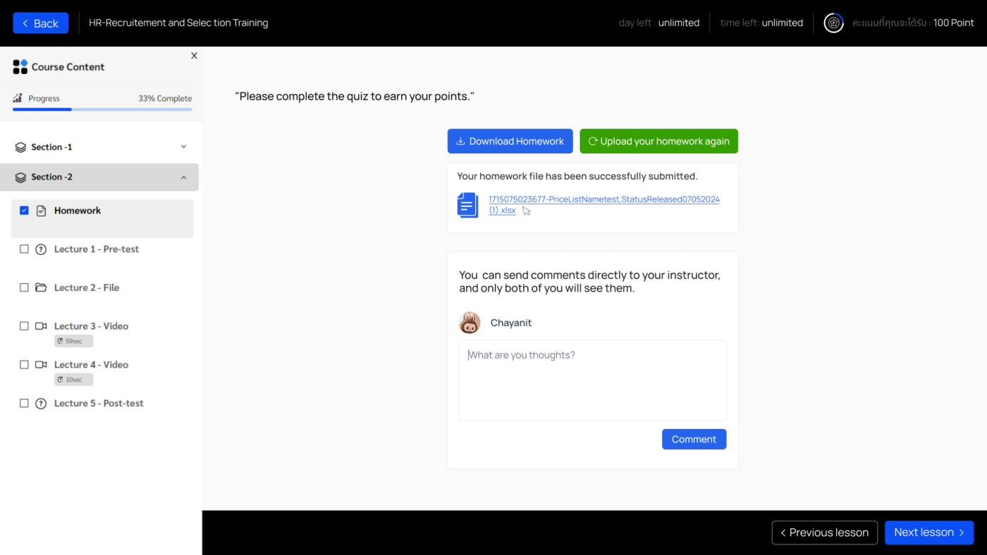 ผู้เรียนสามารถส่งการบ้านให้ผู้สอน โดยการแทรกไฟล์ และสามารถ comment ส่งถึงผู้สอนได้
